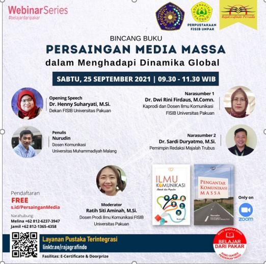 Perpustakaan FISIB bekerjasama dengan penerbit Raja Grafindo melakukan kegiatan Webinar Bedah Buku Ilmu Komunikasi. Webinar dilaksanakan Sabtu 25 September 2021 jam 09.-11.30 wib. Bertema " Persaingan Media Masa Dalam Menghadapi Dinamika Global". Dihadiri oleh mahasiswa, dosen pengajar dan karyawan FISIB serta masyarakat umum dengan jumlah peserta 420 orang.